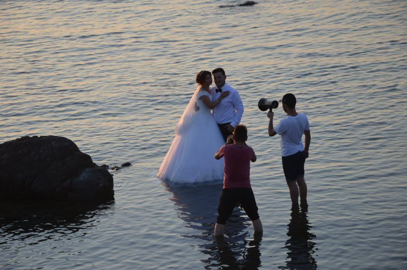Depuis la pointe (un petit côté cap d’Erquy), la mer est magnifique. Les photographes l’ont bien compris puisqu’ils amènent les futurs mariés de la région pour des clichés romantiques. Ainsi se sont succédés six couples au moment du coucher du soleil. La diversité des tenues féminines turques semble bien se refléter jusque dans les robes de ces jeunes femmes.