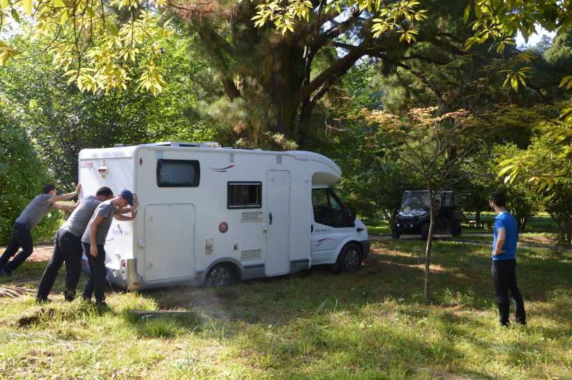 After a quiet and damp night in the botanical garden parking lot, Daniel negotiated to be allowed to park under the tall trees at the entrance, on a lawn that serves as camping for tents. Good idea, except that he chose the most marshy place  and we got bogged down!