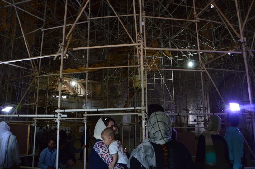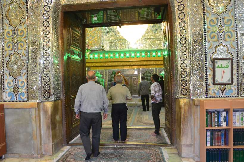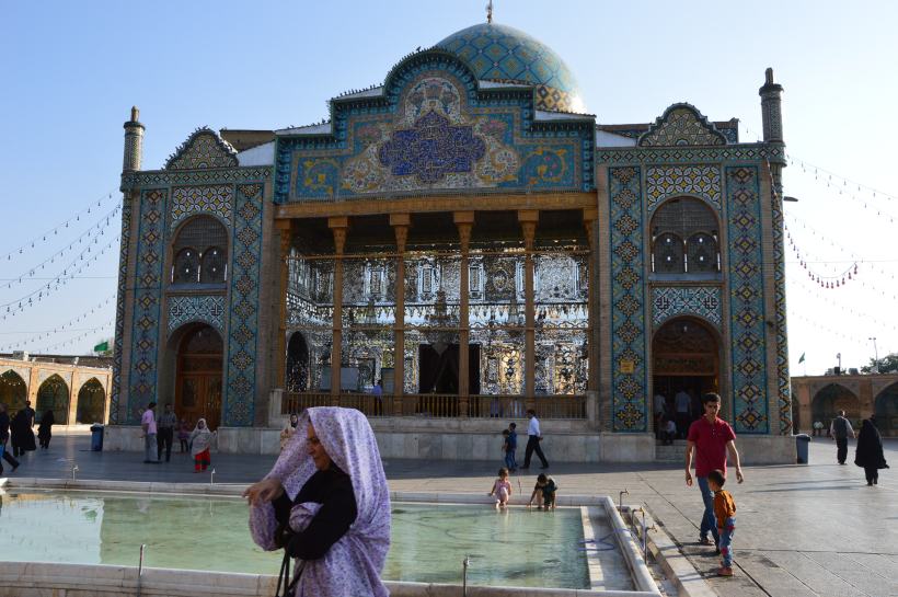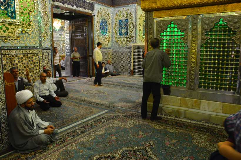 Tout est or, miroirs, lumières et mosaïques autour du catafalque, entouré d’une barrière de bois. Un peu trop cliquant à notre goût ! L’ambiance est très tranquille : on prie, on se repose, on vient toucher le mausolée, des enfants jouent. Rien à voir avec l’austérité des églises ! Les femmes ont leur entrée à l’arrière du bâtiment mais sont confinées dans un petit espace. Tchador strict obligatoire.
