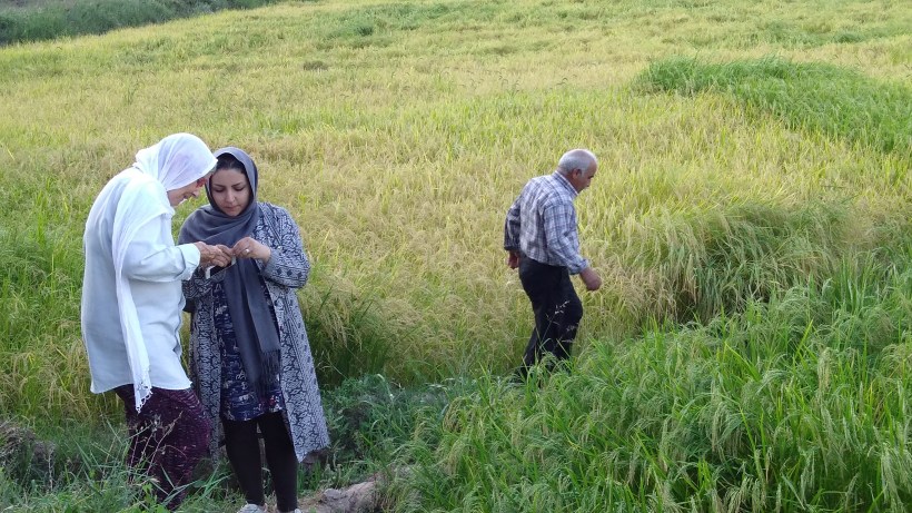 Dès notre premier arrêt près de la rivière, Chon est interpellée par une jeune femme et nous sommes invités à partager des fruits et un thé avec sa famille. C’est le début d’un chaleureux kidnapping qui dure encore quatre jours plus tard. Après le thé, on est invité au village des parents, riziculteurs en retraite. Superbe endroit avec une vue imprenable sur les cultures et la montagne, l’Alborz. Le vert tendre des rizières contraste avec l’orange des pentes.