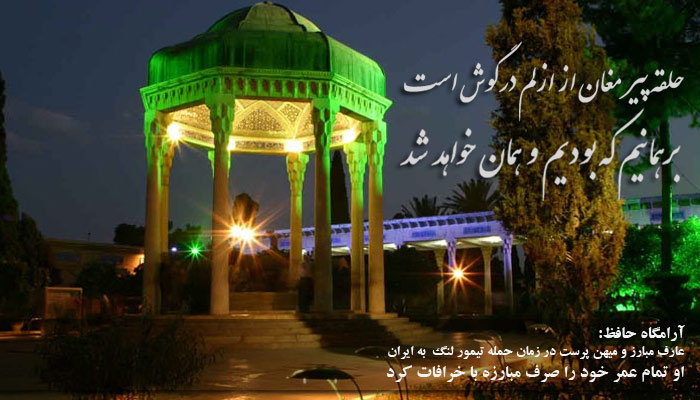 « Je te salue, ô Chirâz, cité incomparable ! Que le ciel te protège de tout danger : j’adresse mille et mille louanges à ce pays que la lumière céleste a gratifié de tant de splendeurs… ô pèlerins de l’Amour, venez à Chirâz et l’Amour, si votre coeur l’implore, vous comblera de tous ses dons  » (Hâfez)