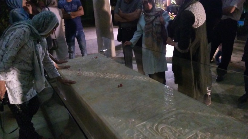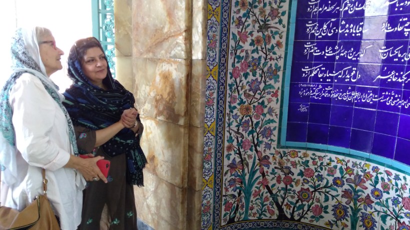 Installés sous les arbres du parc Azadi (N29.629931, E52.542737), nous avons retrouvé Mitra, notre « apparition » d’Ispahan. La première chose qu’elle nous a fait découvrir… c’est la sépulture de Hafez. Ce poète né en 1213 est un monstre sacré de la poésie en Iran. Chaque famille possède le recueil de ses poésies -c’est le livre le plus vendu après le Coran- et chaque iranien peut en réciter quelques vers. Ses textes, entre profane et sacré, lui ont acquis un statut proche de celui d’un prophète.