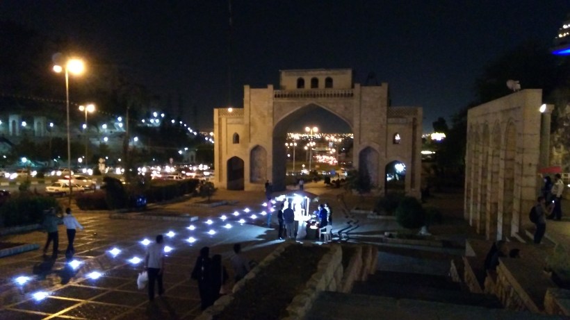 Le lendemain, c’était le tour de la tombe de Khajoo Kermani, un troisième poète chirazi. Elle est située, non pas dans un jardin, mais à l’entrée de la ville, au flanc d’une colline d’où descend une très belle chute d’eau. Il s’agit en fait de l’entrée historique de Chiraz quand on arrive du nord. Un arc de triomphe, qui s’y trouve encore, était un passage obligé pour les voyageurs. Il héberge au sommet un Coran très ancien et passer dessous était signe de bonne augure pour les caravanes qui quittaient la ville ou y pénétraient. La colline est aménagée en terrasses et il fait bon s’y promener à la fraîche. On y a une vue imprenable sur la ville. Là aussi un arrêt est obligatoire pour toucher la tombe du poète dont la statue domine la cité !