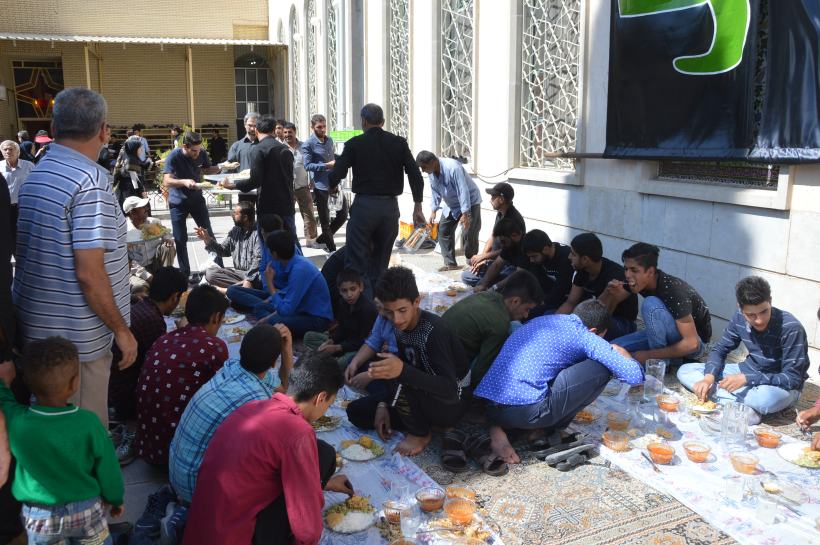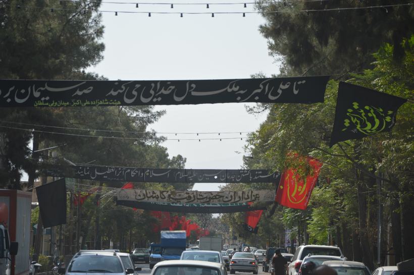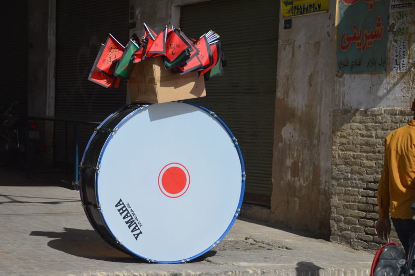 En fait c’est tout le mois de Moharram qui est une période de deuil. Les gens s’habillent encore plus en noir, Tchador pour les femmes, pantalons et chemise noire pour les hommes. Les villes se drapent de banderoles et drapeaux noirs et verts, avec des inscriptions en lettres rouges, symbole du sang des martyrs de Kerbala. Des stands sont montés à tous les coins de rue, distribuant des boissons aux passants et diffusant avec force décibels des chants à la gloire d’Hussein.
