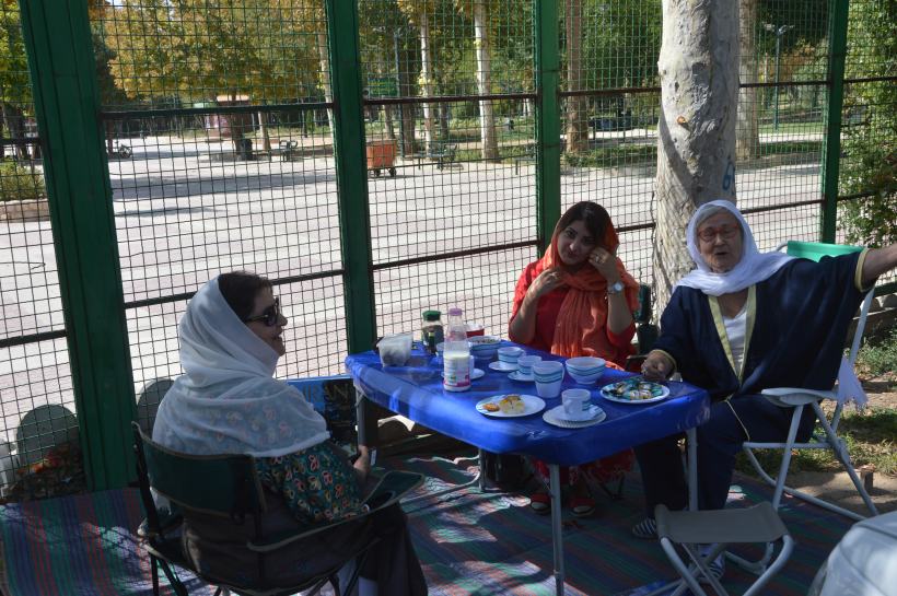 En ce qui nous concerne, Yamin et Mehdi nous ont amené dans la vieille ville -rues étroites, maisons de pisé- dans un sanctuaire soufi. Dès l’entrée, on a été séparés, hommes d’un côté, femmes de l’autre, et on s’est installé devant des repas de poulet et riz offerts à tout le monde . Comme d’habitude en Iran, on a mangé assis plus ou moins en tailleur sur des tapis.