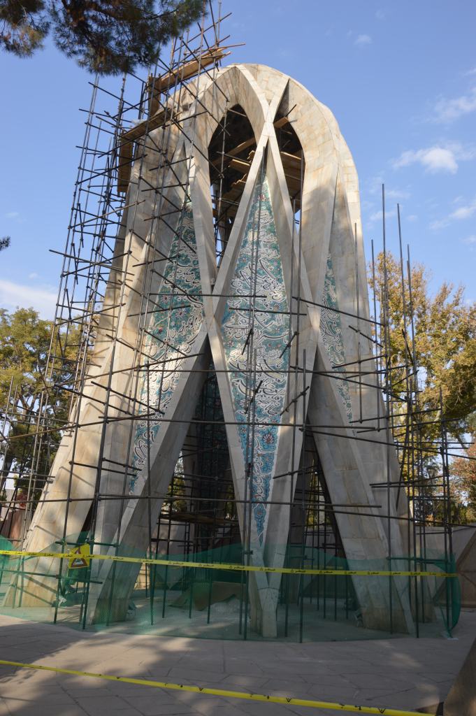 Le premier jour, nous nous sommes arrêtés à Nishapour pour saluer la tombe de Omar Khayyam, dans un parc où il cohabite avec un saint chiite et son mausolée. Le parc est séparé en deux : à droite le mausolée et un grand nombre d’iraniens, et à gauche derrière des grilles, la moité du jardin qui abrite le monument à Khayyam. Gratuité à droite, et ticket à gauche côté Khayyam. On n’est pas radins mais quand même ! Quand en plus on découvre que le monument est en réfection et couvert d’échafaudages, on comprend qu’il n’y ait personne et on a l’impression d’avoir été arnaqués !
