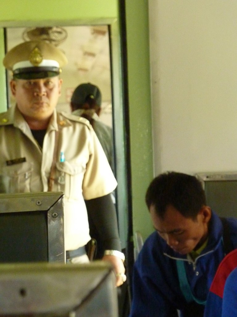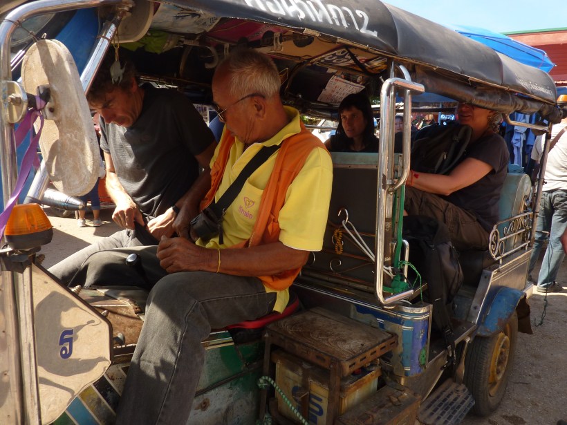 Le terminus est à Aranyapratet, à sept kms de la frontière. Ce sera notre premier tuk-tuk du voyage, pour la rejoindre. On a réussi à s’entasser à six avec les bagages dans un seul engin, à peu près aussi grand qu’une cabine téléphonique ! Chacun a du payer 20 baths, soit 0.75 €.