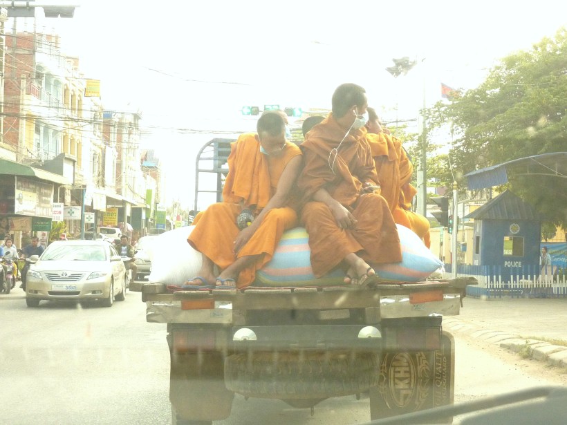 Le passage de frontière s’est passé sans problème et nous avons pris un grand taxi, toujours à six (on s’était fait des amis catalans et suisses dans le train) pour Battambang. La route est en travaux et il nous a fallu 3 heures pour rejoindre confortablement la deuxième ville du Cambodge, avec quelques clichés sympas sur le trajet.