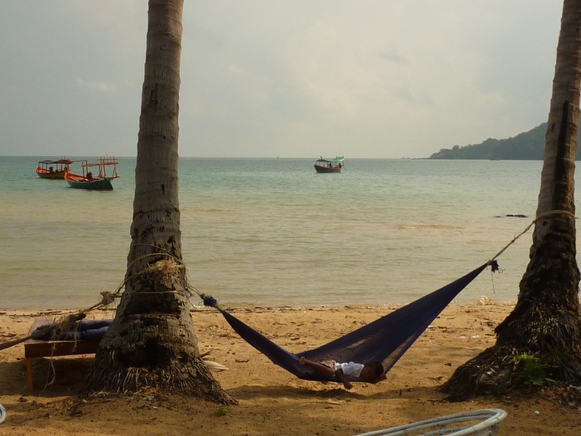 La plage est superbe, sans le mur de restaurants de celles de Sihanoukville et le sable fin est à la hauteur des dépliants touristiques. S’y baigner est un plaisir, à condition d’oublier les ordures sous les arbres le long du rivage.