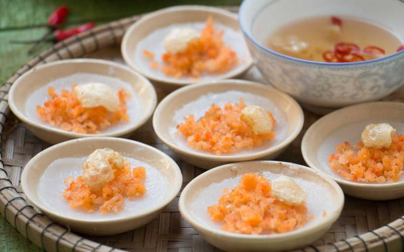 Les Ban Béo sont de touts petits flans de riz garnis de crevettes hachées et de petits oignons frits. Génial.
