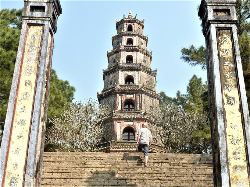 On a beau être un peu lassés des visites de monuments, il faut reconnaître que la pagode Thien Mu vaut le détour. Idéalement placée sur une butte, elle domine le fleuve en haut de son escalier monumental.