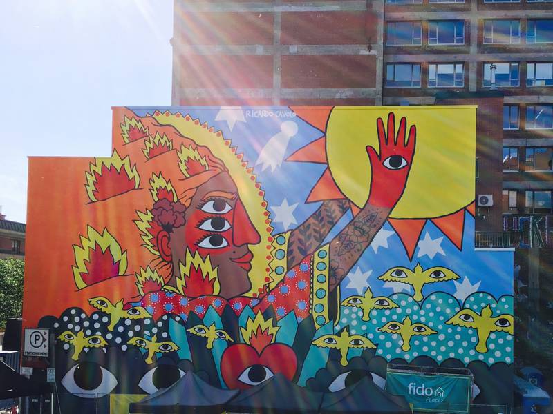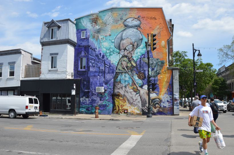 Depuis le Mont Royal, nous avons descendu le Boulevard Saint-Laurent en direction du Vieux-Montréal. Passant par le quartier portugais, puis le quartier juif -excellent sandwich de viande fumée chez Schwarts-. On y découvre, au hasard des ruelles adjacentes, les murales qui sont un des charmes de la ville.