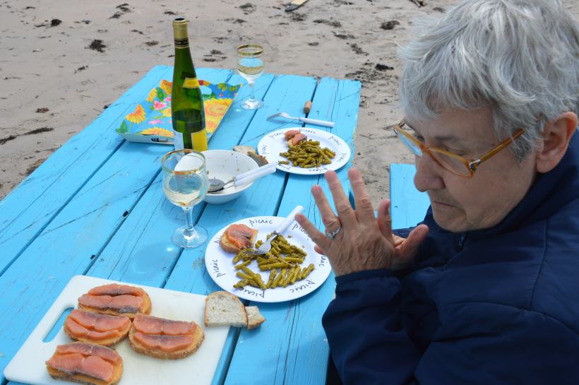 Nous méritions bien, après ces mille kms, un pique nique sur la plage, avec des toasts de saumon fumé d’Aguanish sur un lit de beurre de chicoutai, accompagné par un Alsace made in Riquewihr, miraculeusement arrivé jusqu’au dépanneur local.