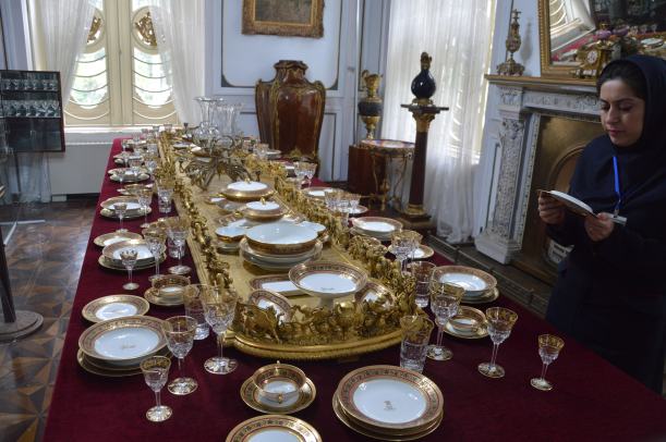 La visite de l’intérieur n’est pas vraiment une surprise. On savait depuis son palais de Téhéran qu’il aimait les styles Louis XV, Louis XVI et Empire. On a demandé à une guide de retourner les assiettes sur la table dressée dans la salle à manger : c’est du Haviland de Limoges !