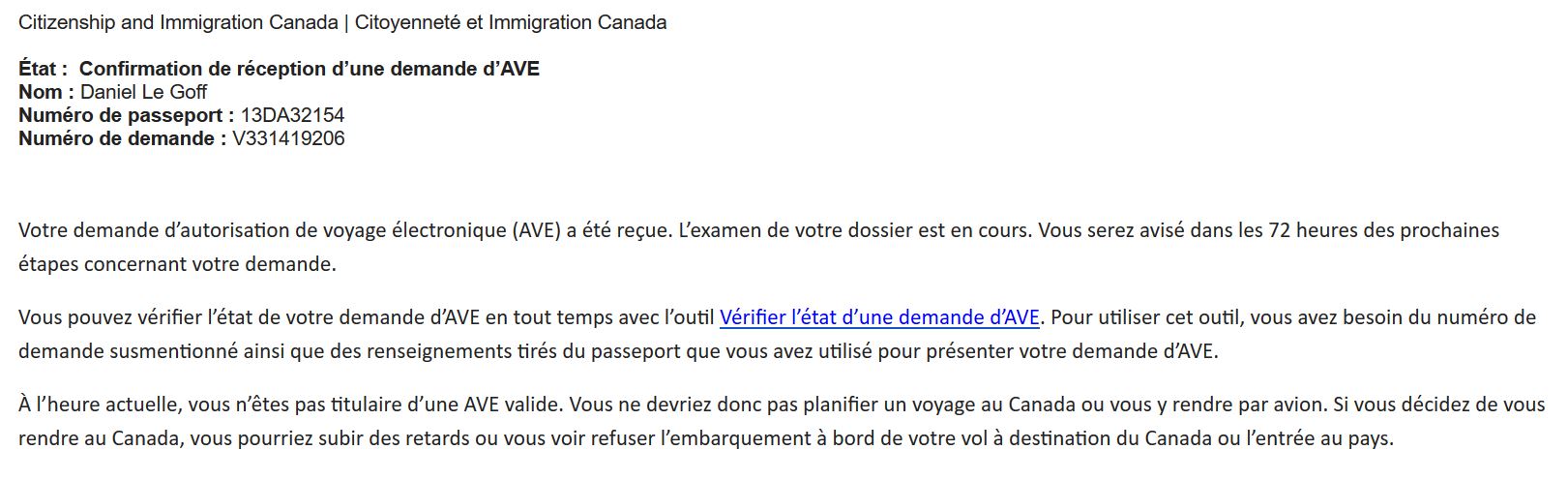 Panique à bord. Daniel part à l’autre bout de l’aéroport chercher du réseau (Free, c’est pourri à Orly) et commence à saisir fébrilement sur le site ad hoc les formulaires d’AVE, les doigts tremblants sur le téléphone. Au milieu de la saisie, alerte au paquet suspect : il faut dégager en urgence… et recommencer les manoeuvres à l’autre bout de la salle. Finalement, après une demie-heure de sueurs froides, ça marche et le Ministère de l’Immigration canadien nous envoie gentiment deux accusés de réception nous garantissant une réponse… sous 72h. Nous sommes alors à deux heures du décollage.