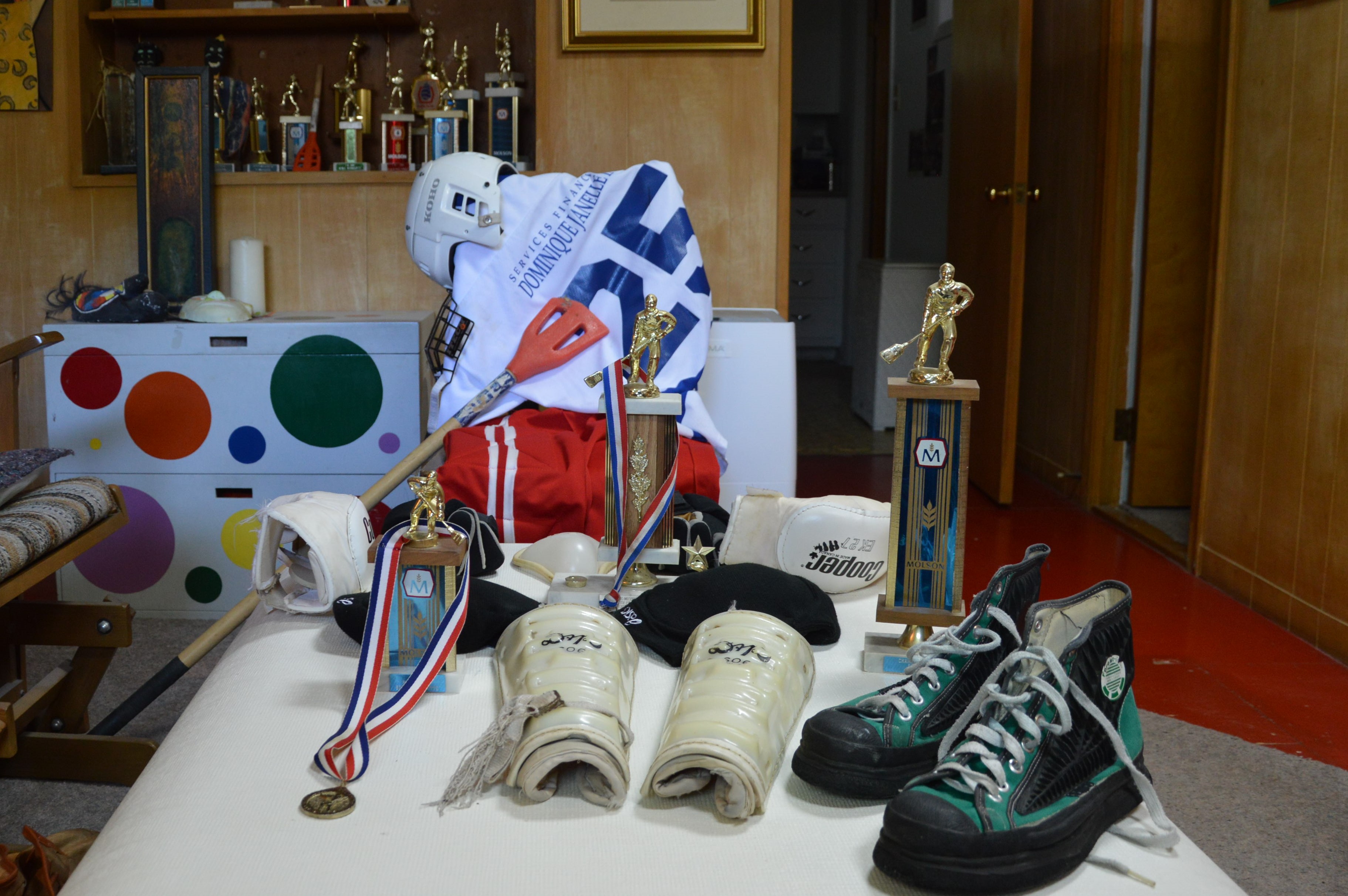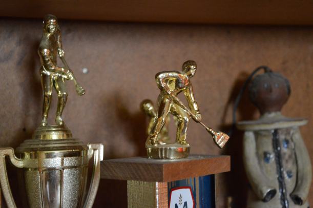 Mais que sont donc ces trophées représentant un joueur tenant une espèce de balai ? Serge, le champion maintes fois récompensé dans la discipline, nous a donné les clés de l’énigme. Ce sont des récompenses de compétitions de ballon-balai !