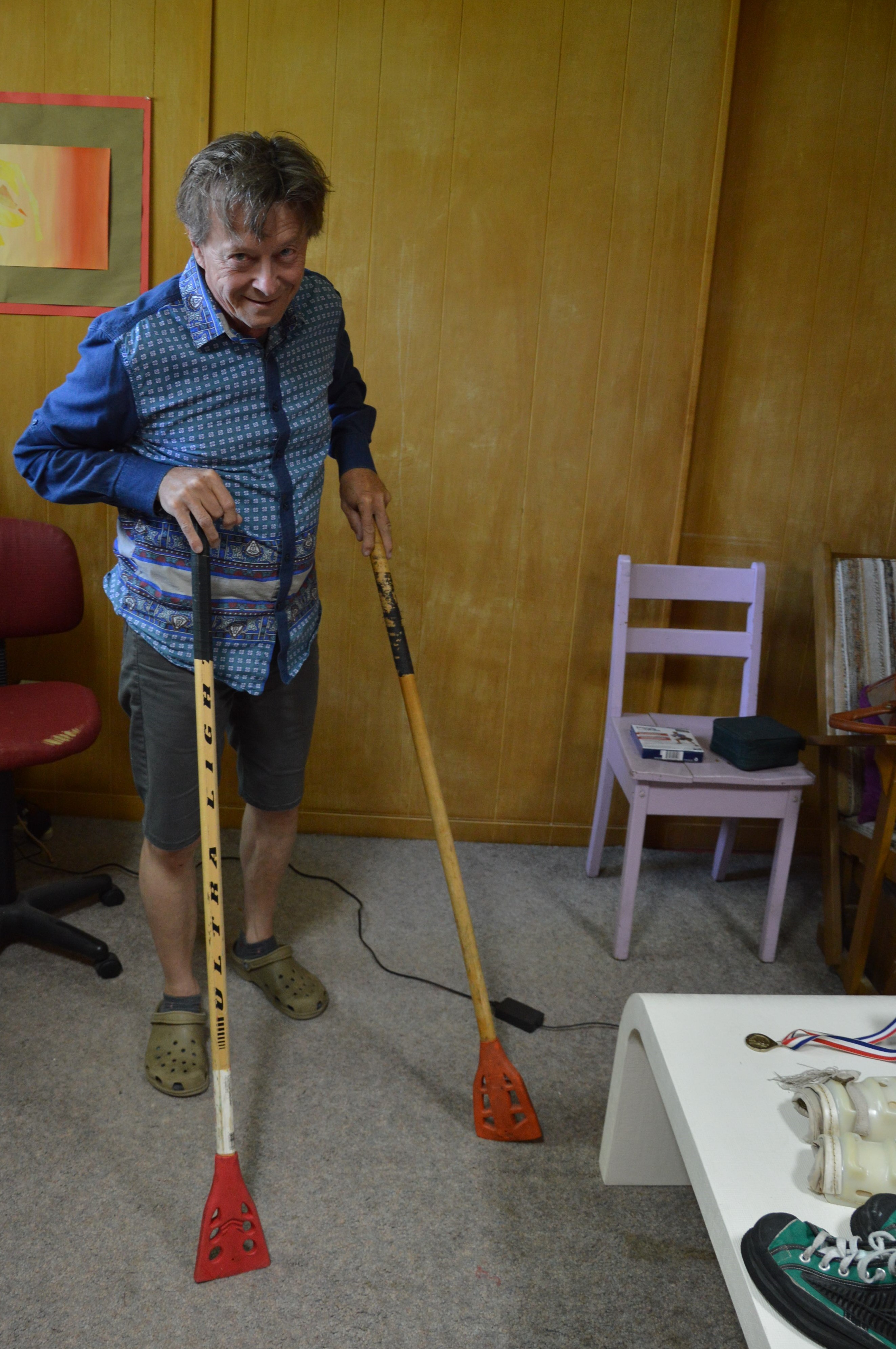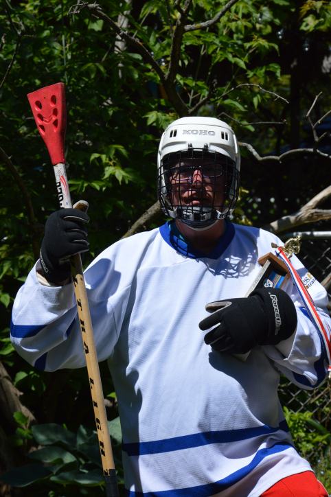 Il semblerait que ce sport, une sorte de hockey du pauvre – soit en perte de vitesse. Cela n’a pas empêché Daniel de revêtir l’équipement. Bon OK, la chasuble est un peu grande et il manquait la patinoire mais ce qui compte c’est que le pantalon soit rembourré, pour éviter de se faire mal aux foufounes* en cas de chute.