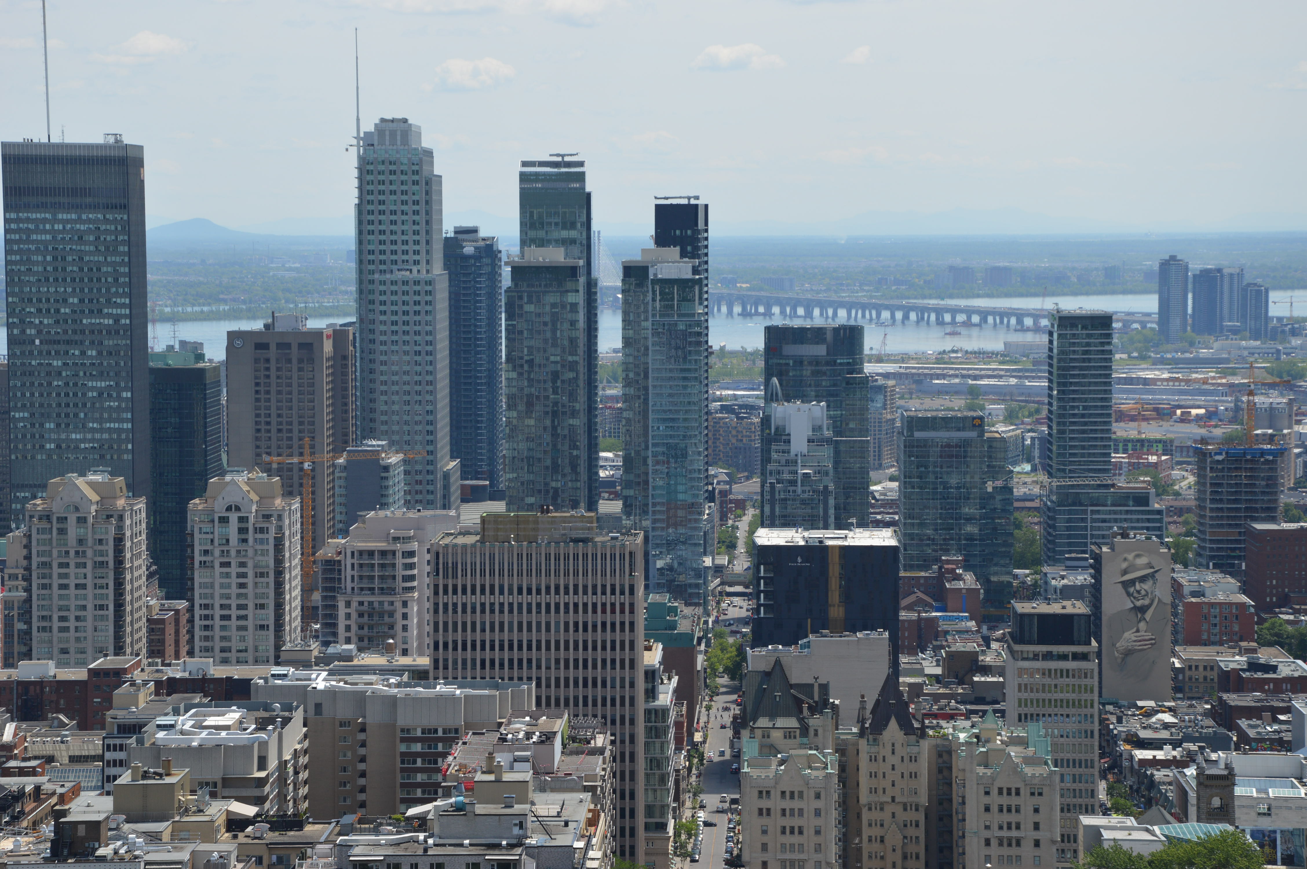 Montréal est dominée en son centre par le Mont Royal. Cette grande colline boisée est le paradis des promeneurs et des touristes. Les belvédères permettent d’appréhender la cité dans toutes les directions. En regardant vers le sud et le fleuve depuis le sommet, sur un immeuble, un magnifique portrait de Léonard Cohen. Saurez-vous le retrouver ?