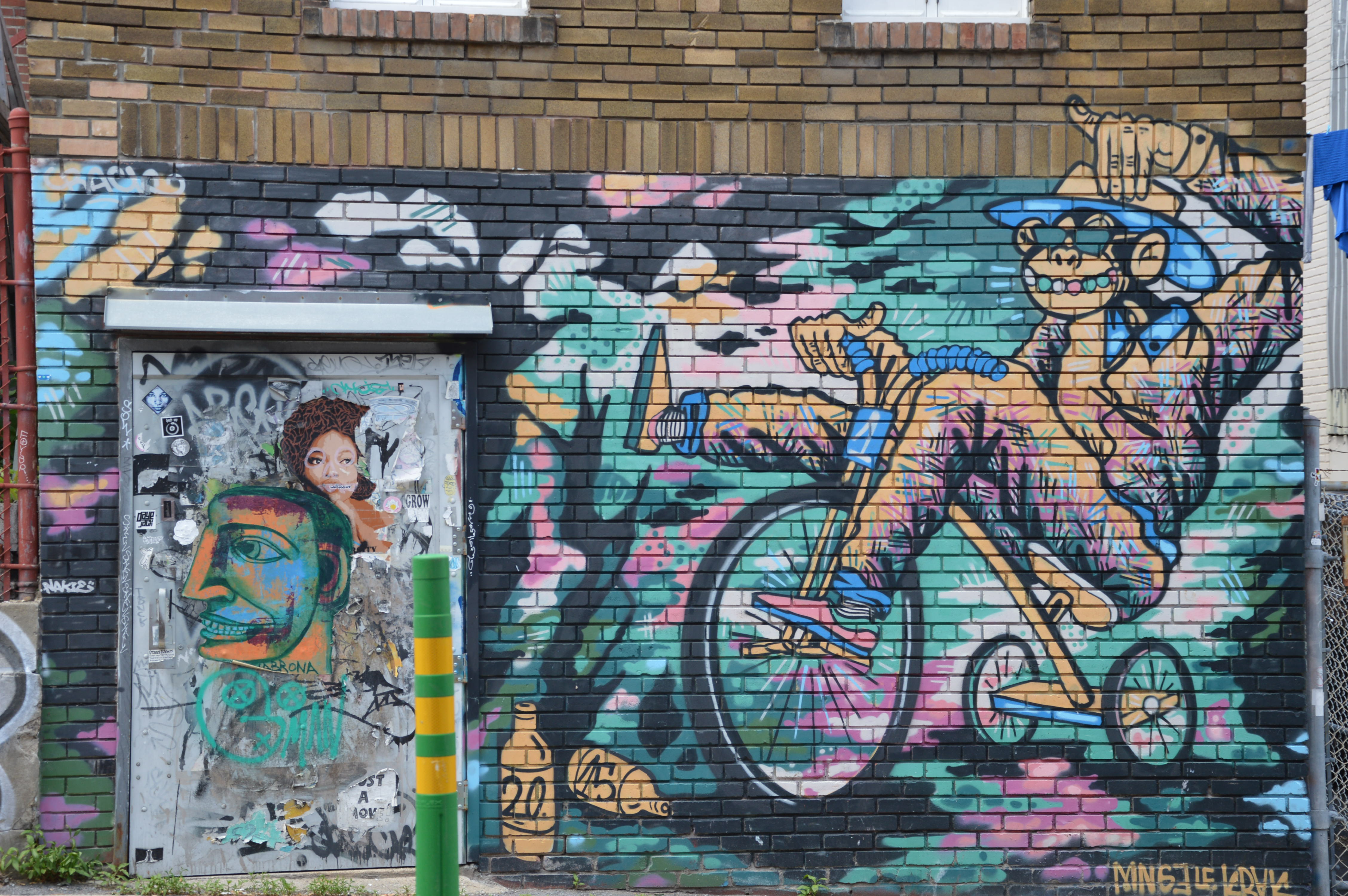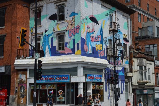 Depuis le Mont Royal, nous avons descendu le Boulevard Saint-Laurent en direction du Vieux-Montréal. Passant par le quartier portugais, puis le quartier juif -excellent sandwich de viande fumée chez Schwarts-. On y découvre, au hasard des ruelles adjacentes, les murales qui sont un des charmes de la ville.